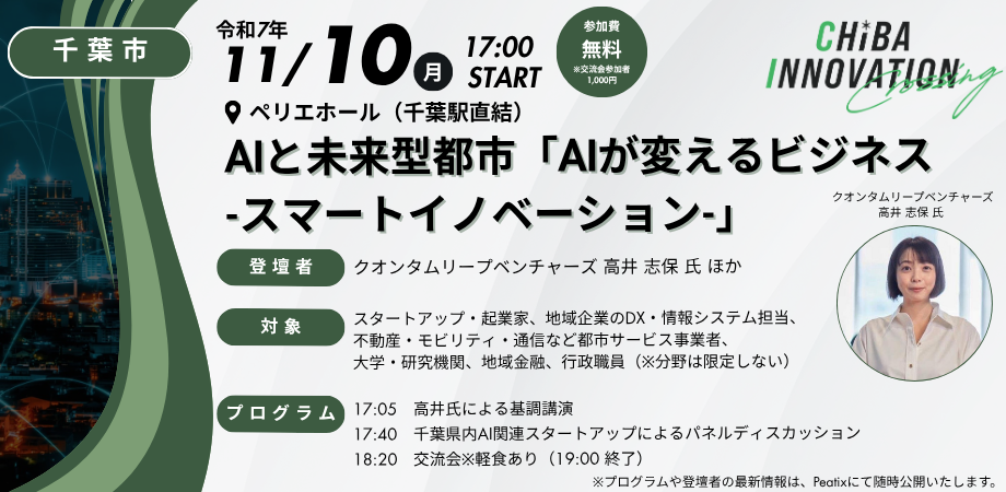 令和7年11月10日(月)に千葉市で行われる「AIと未来型都市「AIが変えるビジネス― スマートイノベーション」」のイベント参加者募集を開始しました。