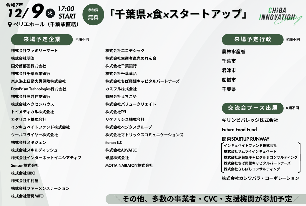 2025年12月9日(火)、千葉市で開催する「千葉県×食×スタートアップ」の参加予定企業・行政を更新しました。