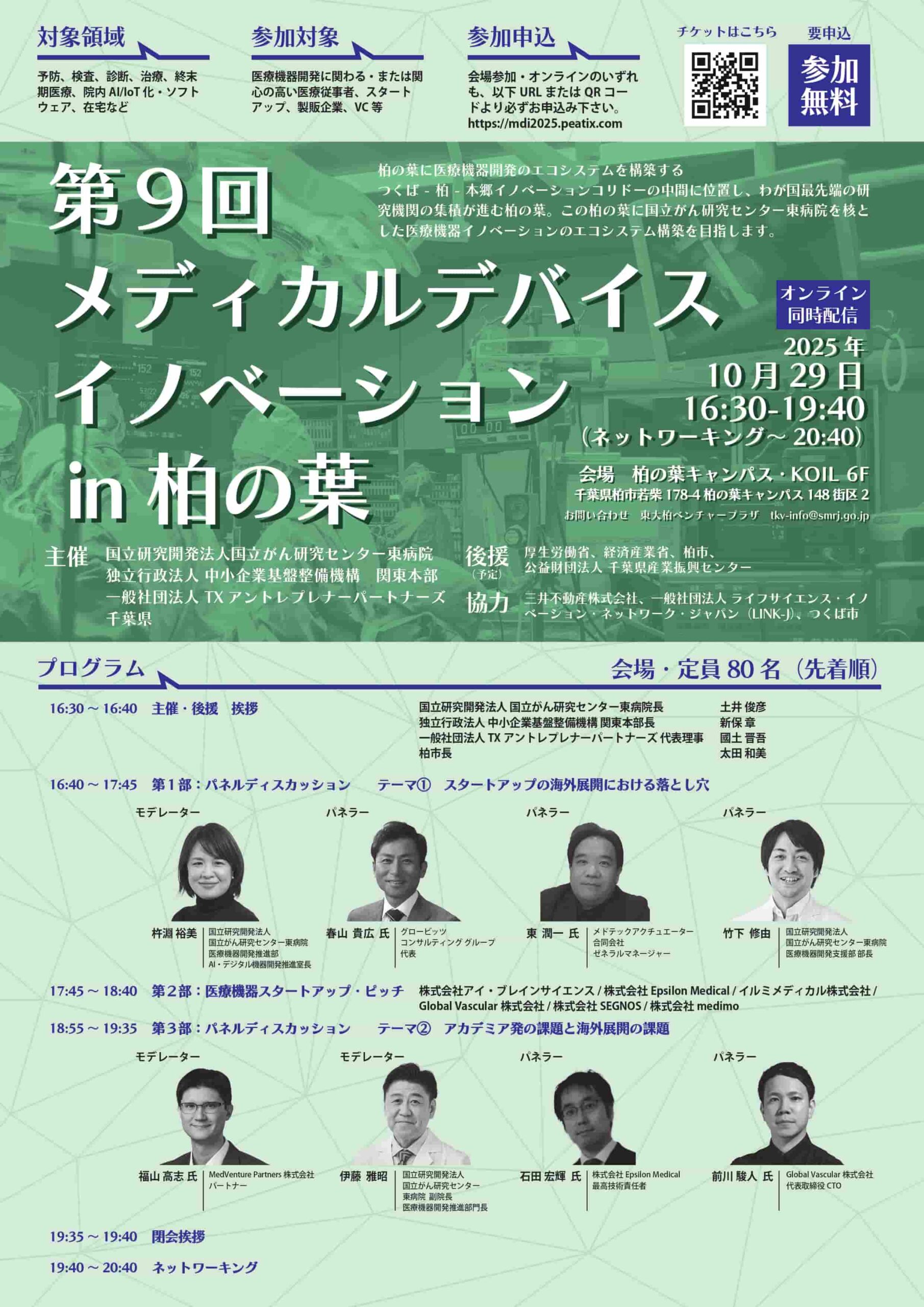 本イベントを起点に、世界トップレベルの研究機関が集積する柏の葉から、医療機器開発のエコシステム構築に向けた取り組みを継続していきます。皆様のご参加をお待ちしております。