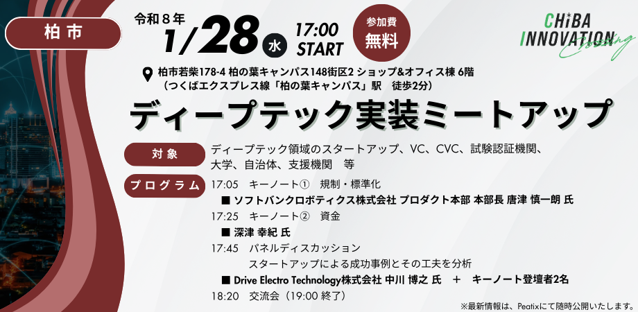 千葉県では、多様な主体との連携により、スタートアップ等の成長を促すコミュニティを形成するため、スタートアップ、大企業、投資家などによる交流イベントを県内3ヵ所(千葉市・柏市・木更津市)で定期的に開催しております。