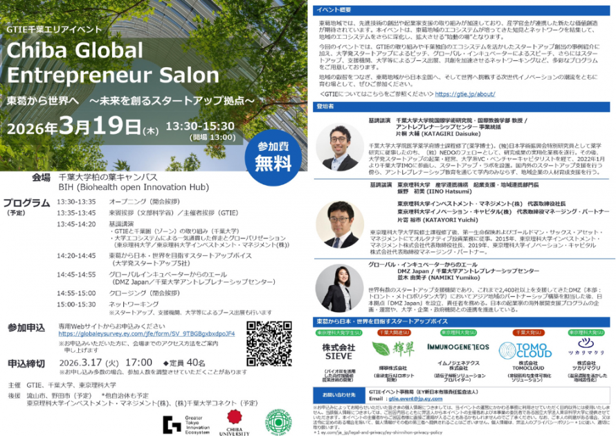 東葛地域のスタートアップ創出と成長をテーマに、GTIEと千葉大学、東京理科大学が連携し、大学発の取り組みや先進事例、スタートアップの声を紹介するイベントです。講演やピッチ、交流を通じて、地域から世界を目指すイノベーション・エコシステムの強化を目指します。
